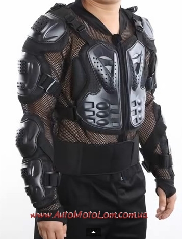 Эта популярная и надёжная экипировка райдера – хорошо продуваемая курточка из износостойкой сетчатой ткани. К мото черепахе крепится целый набор специальных щитков, прикрывающих важные участки верхней части тела мотоциклиста. А это гарантирует защиту: - ключицы и предплечья, - рёбер и груди, - крестца и спины, - поясницы, - плеч и локтей. Также более дорогие и современные модели имеют специальные элементы для шейного отдела позвоночника. Для регулировки размера в конструкции черепахи есть утягивающие фиксирующие ремни и эластичный пояс на липучке для поясницы. Обычно черепаха застёгивается на «молнию».