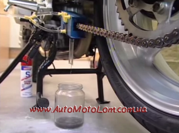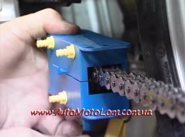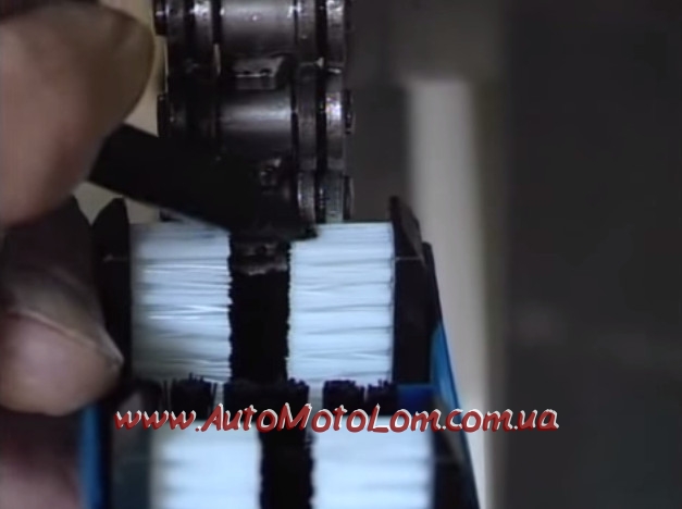 Вопрос «как помыть цепь?» возникает у каждого мотоциклиста с завидной регулярностью, ведь перед нанесением смазки следует удалить и песок, и остатки старой смазки. Провести эту процедуру можно разными способами: вручную и с помощью специальной машинки для чистки цепи. Но второй вариант – более выигрышный. Тем более что он не требует от райдера или механика особых навыков. Поэтому запоминаем, что и за чем мы делаем: 1. Прежде чем приступить к установке машинки, необходимо подрезать щетки под ширину цепи. У меня это не получилось сделать особо аккуратно т.к. щетина довольно жесткая. Но это не сильно повлияло на работу. 2. Установить мойку на мотоцикл оказалось довольно просто. Единственная трудность возникла во время соединения двух половинок между собой. Для этих целей предусмотрена резиновая лента, а ее я боялся порвать и не тянул сильно. Но все прошло гладко. 3. Следующий этап – это фиксация машинки для мойки цепи. Очень важно, чтобы она была на одном месте. Закрепить этот девайс можно с помощью веревочки и двух крючков разных размеров. Сложность может возникнуть в том, что в одной плоскости с цепью машинка все равно не будет работать неподвижно, а будет смещаться и подклинивать. Для качественной чистки цепи я нашел выход – приобщил к делу помощника, брата. Он крутит колесо, я держу одной рукой корпус машинки, а второй нажимаю на бутылочку с моющей жидкостью. Если же говорить о средстве, которым нужно мыть цепь, так отлично себя зарекомендовал керосин.